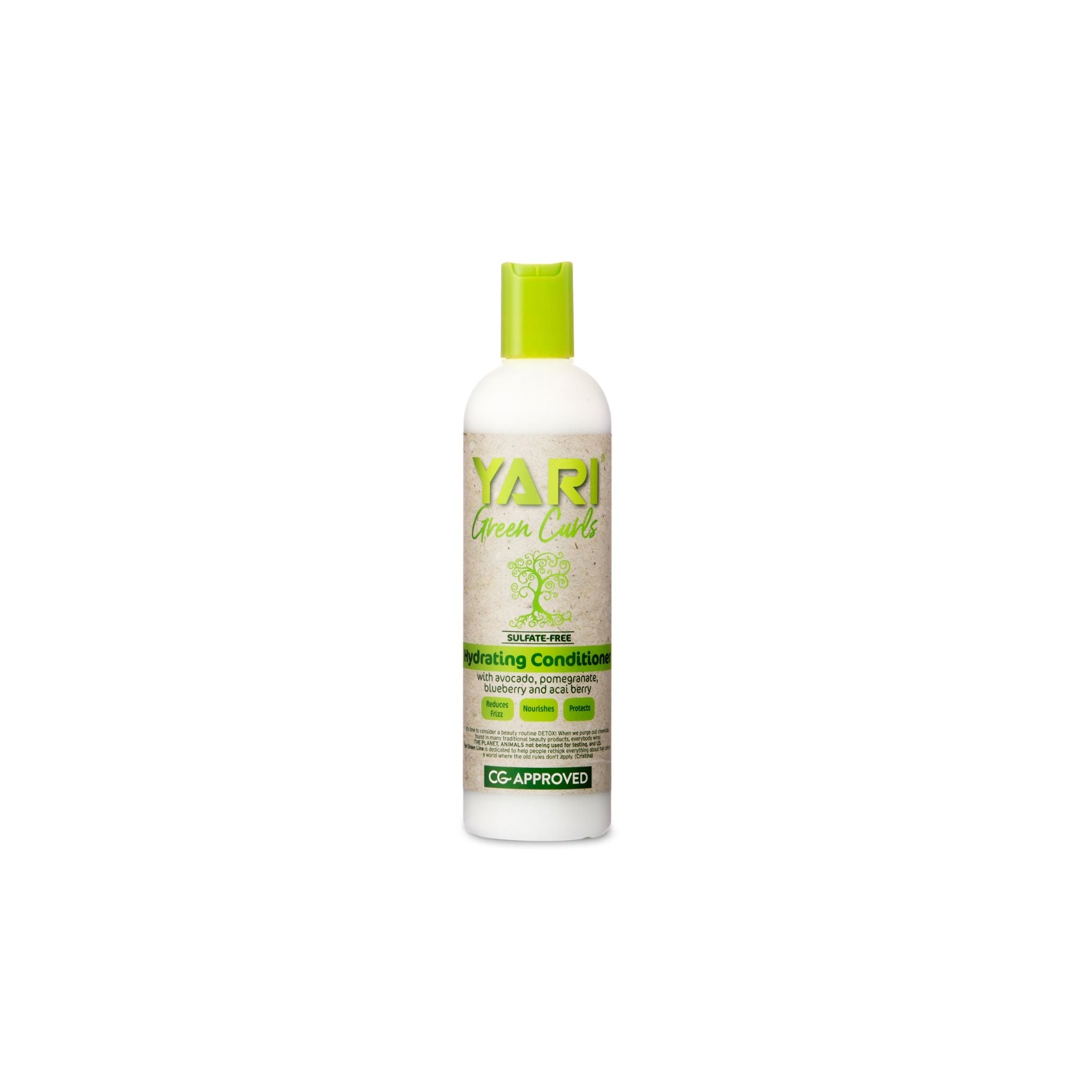 YARI Green Curls Hydrating Conditioner (355 ml). Hvid flaske med grønt låg. Fugtgivende balsam med avocado, granatæble, blåbær og acai. Sulfatfri og CG-godkendt.