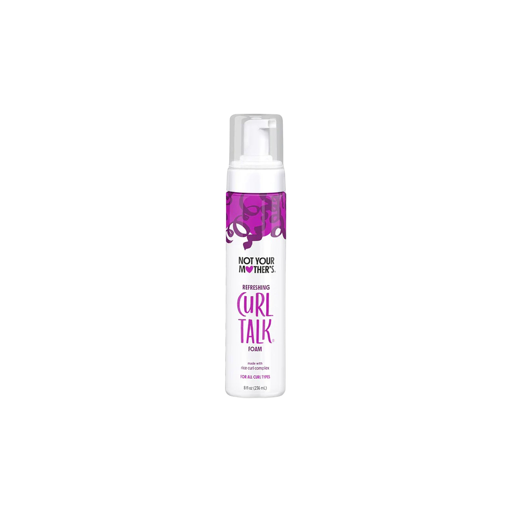Not Your Mother's Curl Talk Refreshing Foam 236ml med lilla design og pumpe, set bagfra med ingrediensliste og produkttekst.